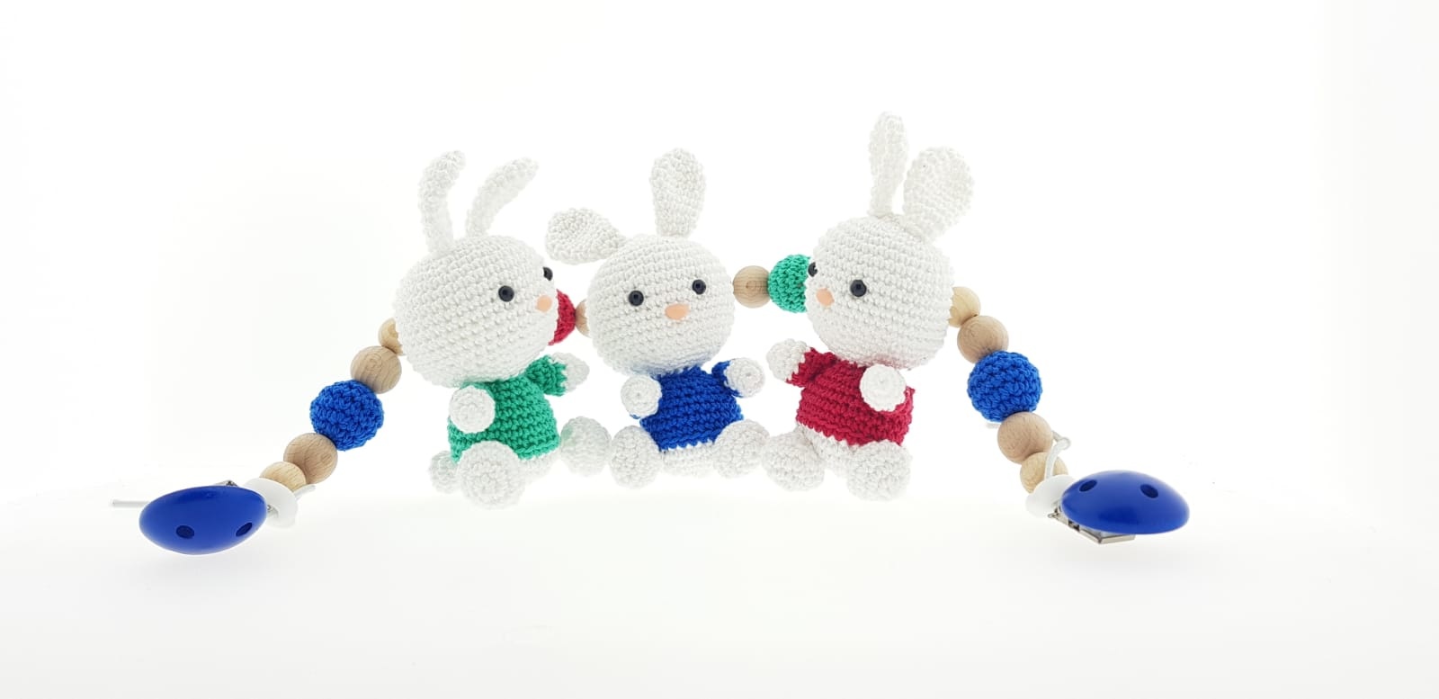 Met het gratis haakpatroon van deze leuke wagenspanner met konijntjes bezorg je je kleintje in de kinderwagen uren speelplezier.