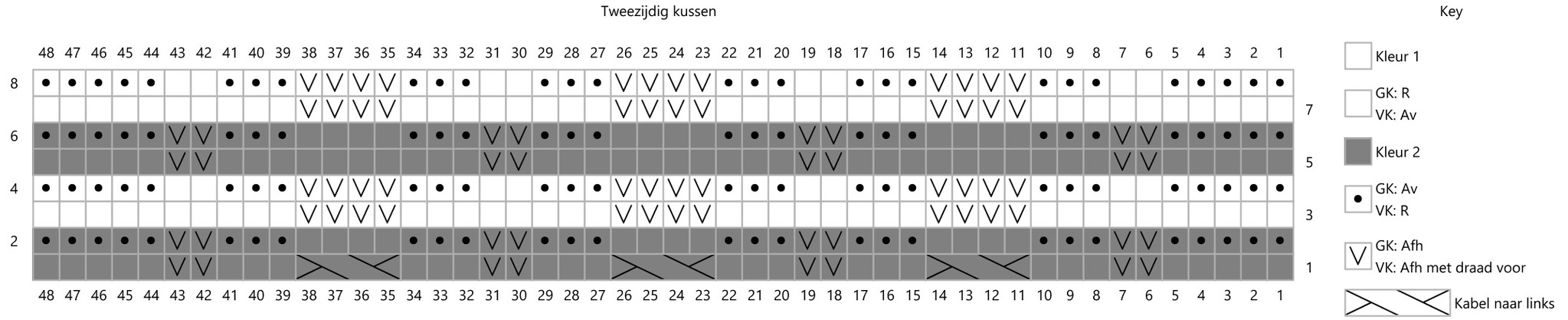 - Toer 8 (GK): K1: 5r, (2afh, 3r, 4st kabel naar links, 3r) x 3, 2 afh, 5r