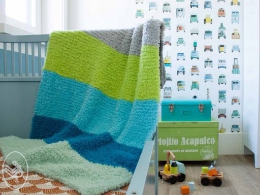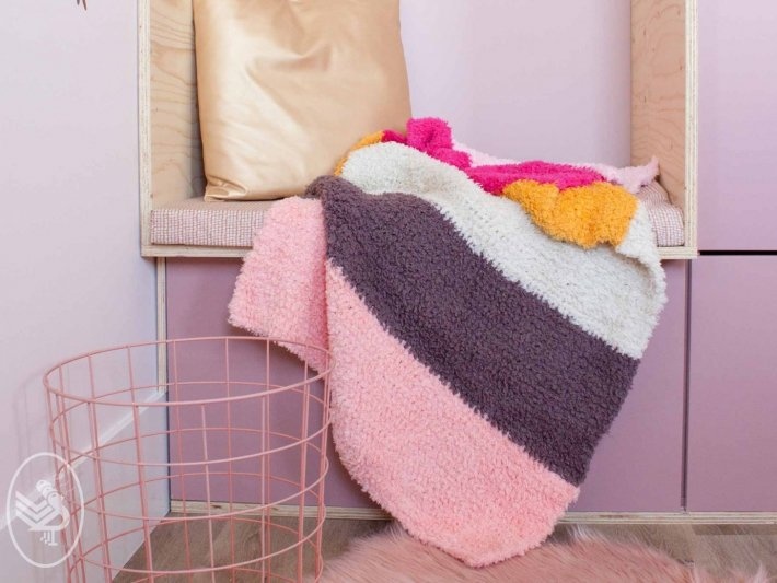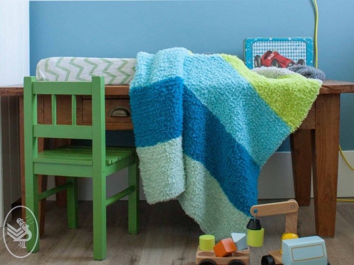 Download het patroon in de productomschrijving. Een superzacht gebreid teddy dekentje met vrolijke strepen. In welke kleuren zou jij ze willen maken?