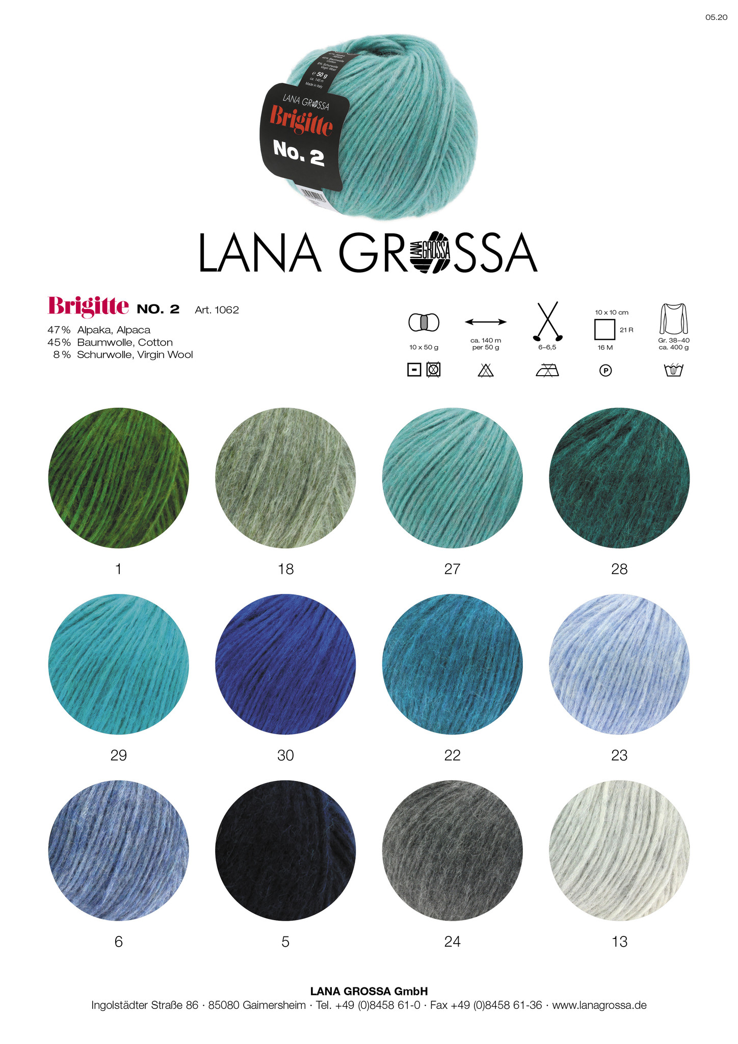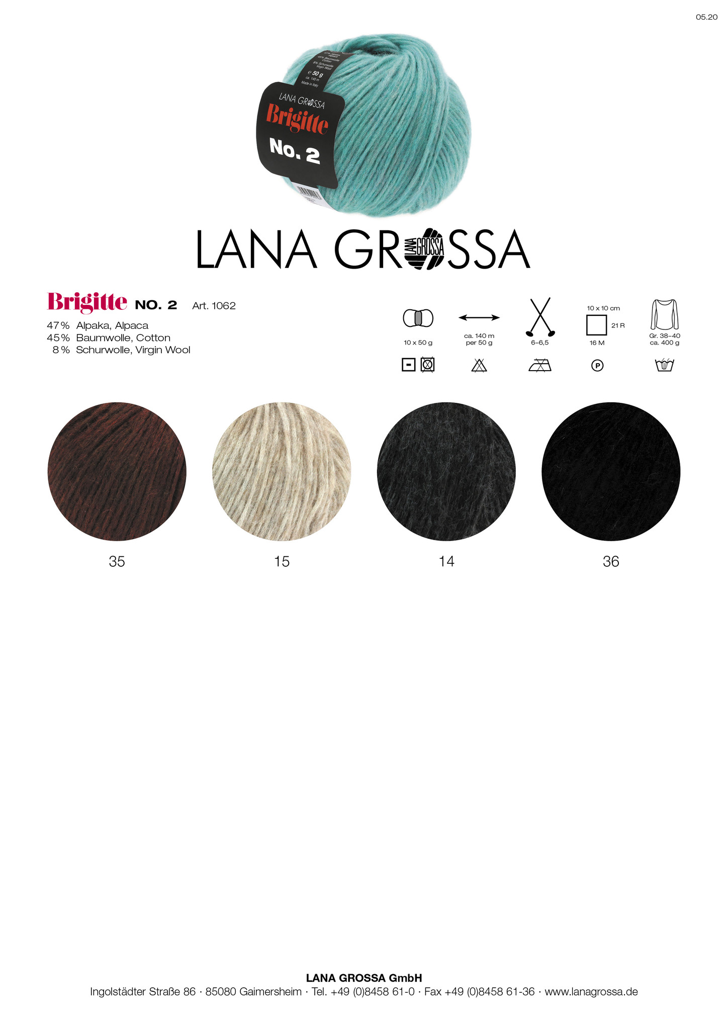 Dit zachte samengestelde garen heeft een zachte finish. De Brigitte NO.2 is een combinatie van Alpaca, Katoen en Scheerwol. Je maakt de mooiste truien en vesten met een pluizig eindresultaat.