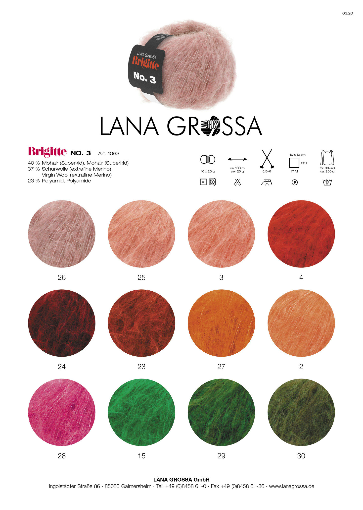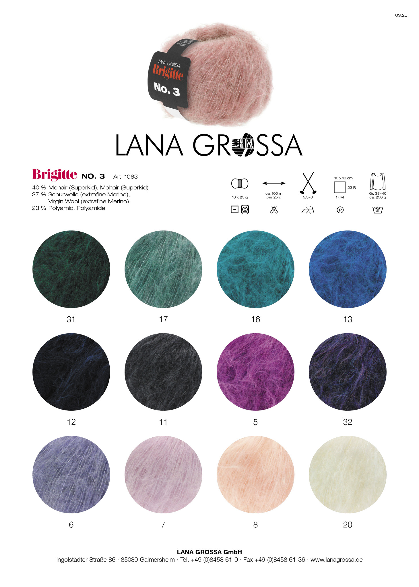 Dit zachte samengestelde garen heeft een zachte finish. De Brigitte NO.3 is een combinatie van Mohair, Merino en Polyamide. Je maakt de mooiste truien en vesten met een pluizig eindresultaat.