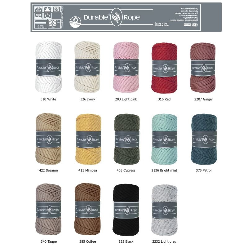 Zijn de jaren zeventig terug? Welnee, macramé is weer helemaal hip! Met dit speciale macramé rope maak je de mooiste dingen voor je huis, zoals plantenhangers, een wandkleed of een dromenvanger. Het Durable Macrame garen is er speciaal voor gemaakt. Durable Macramé touw wordt geproduceerd van 70% gerecycled katoen en 30% gerecycled polyester. Het koord is een stuk stugger en dikker dan gewoon garen. Dat zorgt ervoor dat de werkstukken stevig genoeg zijn. Bovendien kun je het koord goed uit elkaar pluizen, zodat je een plantenhanger of wandkleed kunt versieren met een mooie kwast. Tip: verwerk houten kralen en ringen in je werkstuk voor een creatief resultaat.