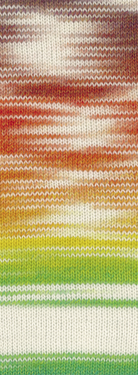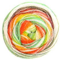 Hoge kwaliteit bol van 60% Merino Scheerwol en 40% Acryl garen. Het kleurverloop heeft de kleuren Oudroze - Wit - Roodbruin - Geel - Pistache - Lichtgroen