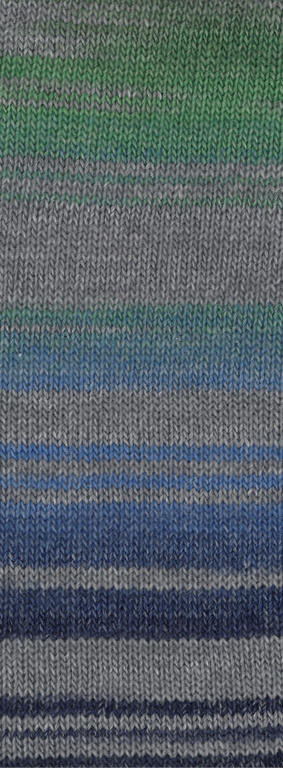 Hoge kwaliteit bol van 60% Merino Scheerwol en 40% Acryl garen. Het kleurverloop heeft de kleuren Groen - Grijs - Middenblauw - Jeans - Donkerblauw