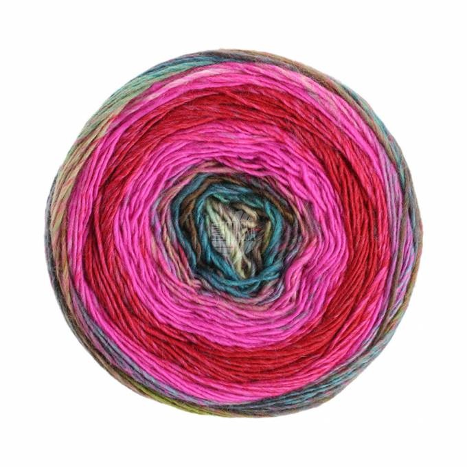 Hoge kwaliteit cake van 100% extra fine Merino Scheerwol. Het kleurverloop heeft de kleuren Roze - Wijnrood - Blauw - Groen Turquoise