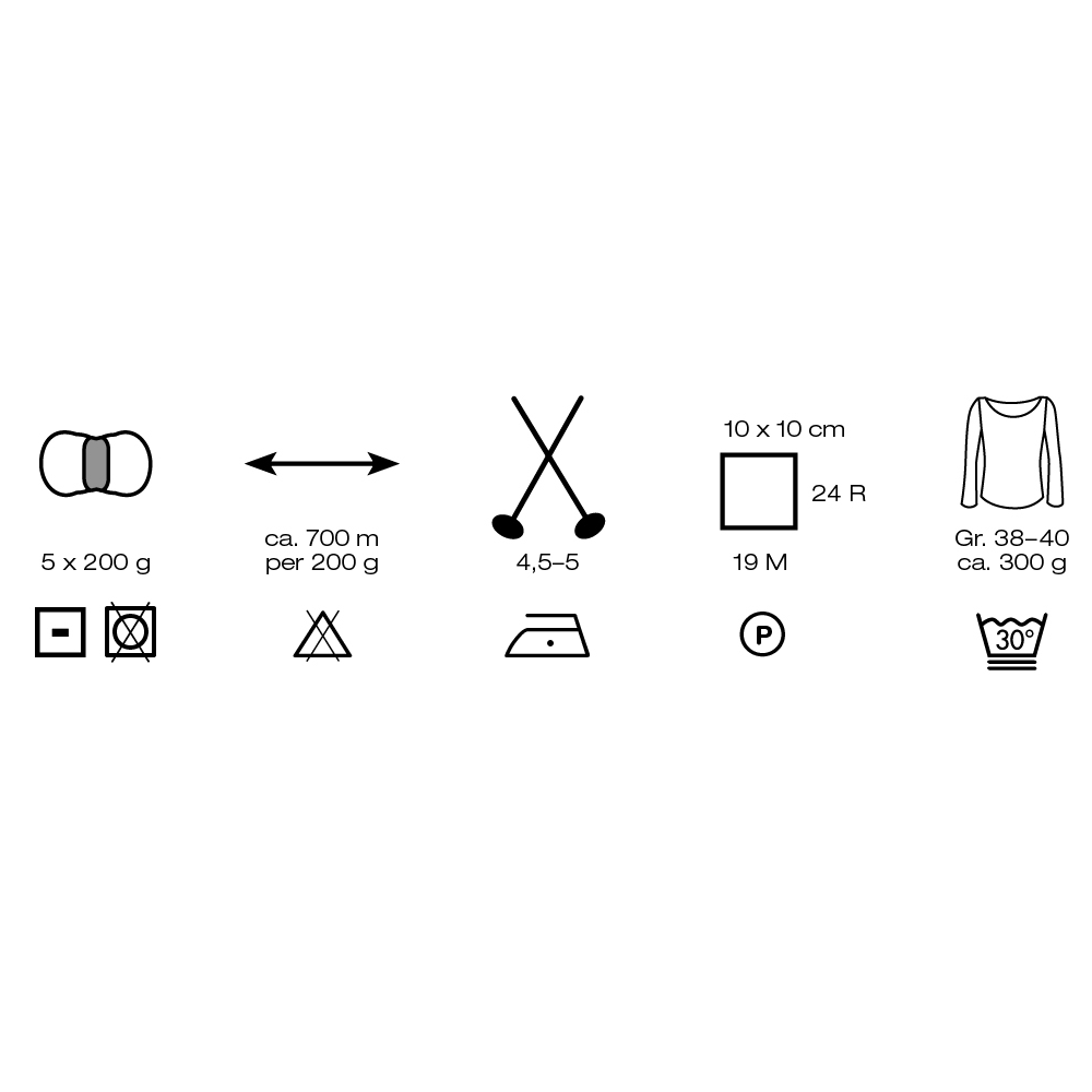 Met een bol Gomitolo Versione maak je een prachtige sjaal, en met 1,5 bol maak je een trui in maat 40 van 60% Merino Scheerwol en 40% Polyacryl. Dit Unieke garen zorgt voor een schitterend eindresultaat.