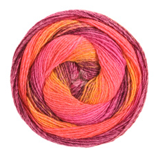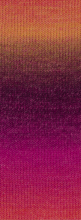 Hoge kwaliteit bol van 60% Merino Scheerwol en 40% Polyacryl garen. Het kleurverloop heeft de kleuren Terracotta - Oranje - Bordeaux - Cyclaam - Roze