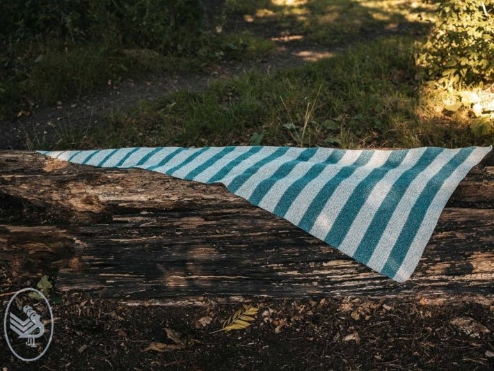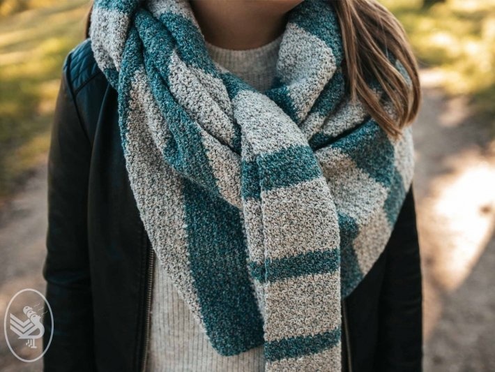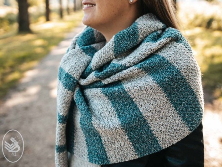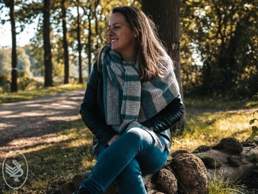 De sjaal is een grote asymmetrische omslagdoek die van onderaan in de punt naar boven toe gehaakt wordt. De strepen zijn gehaakt in twee kleuren en in wisselende diktes geven deze shawl een extra accent. Hierbij is er gekozen voor Durable Forest garens, wat zorgt voor een luxe uitstraling!