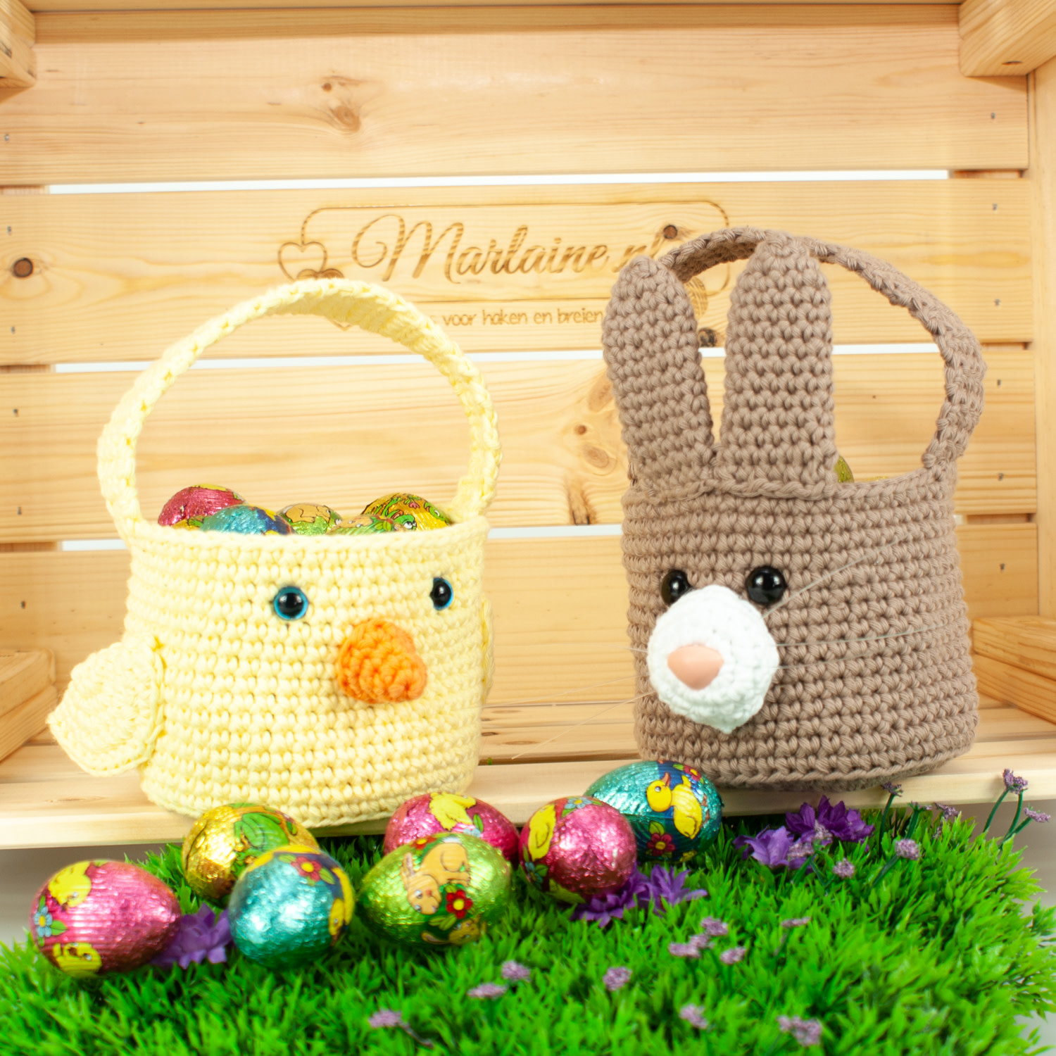 Wij haakten 2 varianten paasmandjes een leuke paashaas en een lief kuikentje.