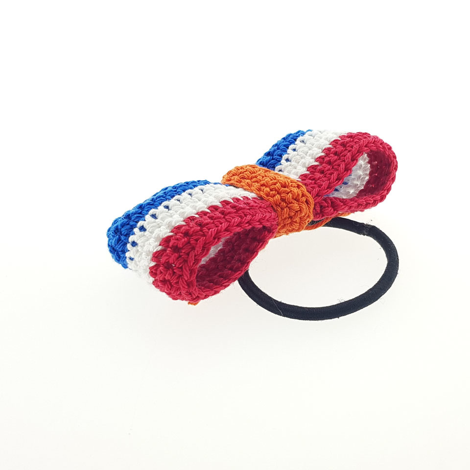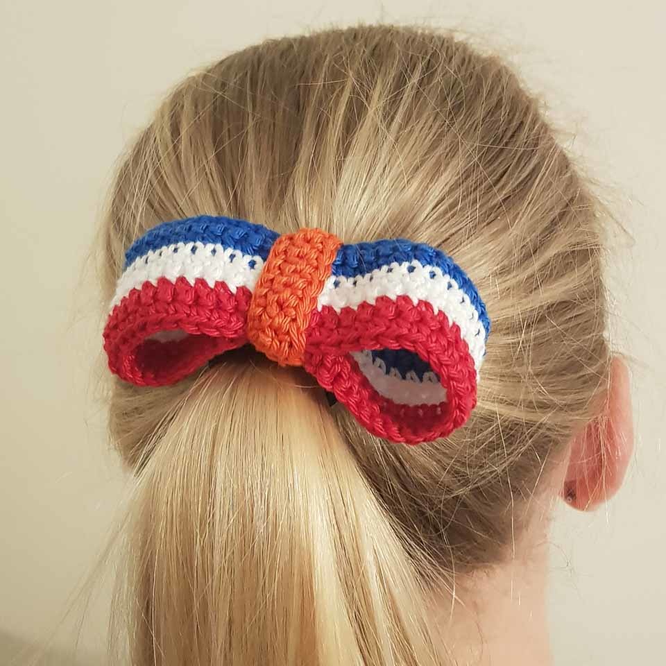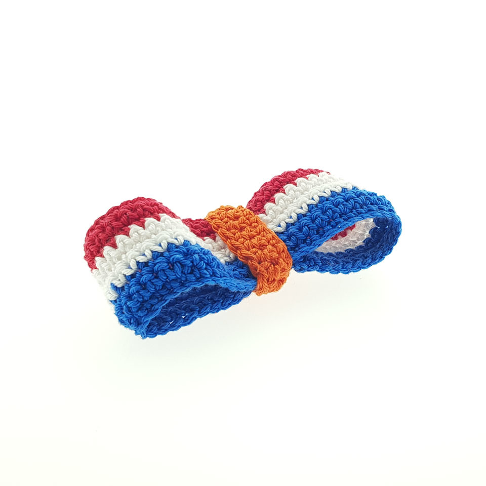 Haak je eigen strikje voor in je haar met de kleuren van de Nederlandse vlag. Leuk voor Koningsdag, en andere oranje feesten.