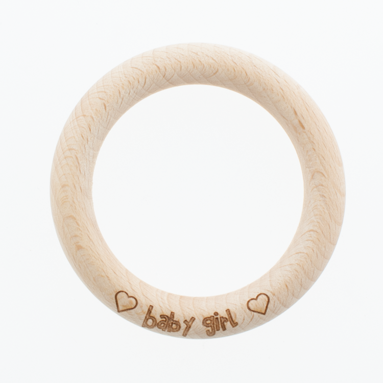 Bijtring met tekst - baby girl - gegraveerd. Speciaal voor de baby van onbehandeld hout.