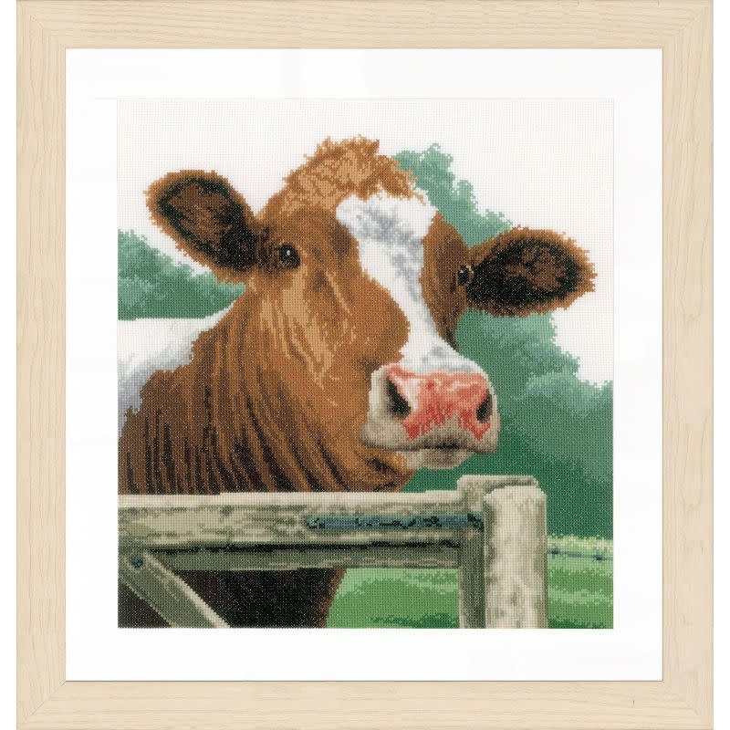 Borduurpakket Lanarte Verwonderde Koe Aida in het rood bont.