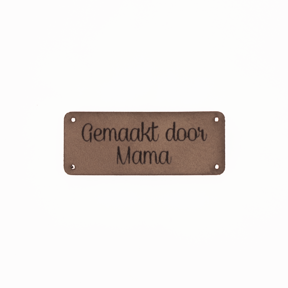 Leren label met de tekst 'Gemaakt door Mama' in de maat 20mm bij 50mm. Verkrijgbaar in verschillende kleuren. Eenvoudig te bevestigen aan je handwerk door de 4 gaten in het label.