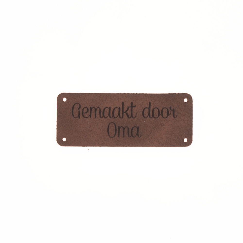 Leren label met de tekst 'Gemaakt door Oma' in de maat 20mm bij 50mm. Verkrijgbaar in verschillende kleuren. Eenvoudig te bevestigen aan je handwerk door de 4 gaten in het label.