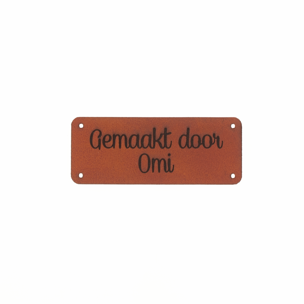 Leren label met de tekst 'Gemaakt door Omi' in de maat 20mm bij 50mm. Verkrijgbaar in verschillende kleuren. Eenvoudig te bevestigen aan je handwerk door de 4 gaten in het label. Speciaal voor onze Belgische fans!