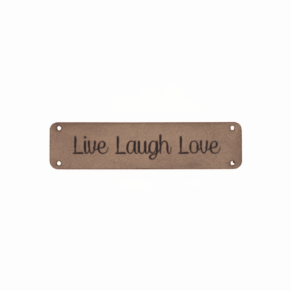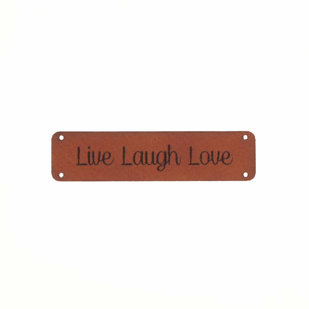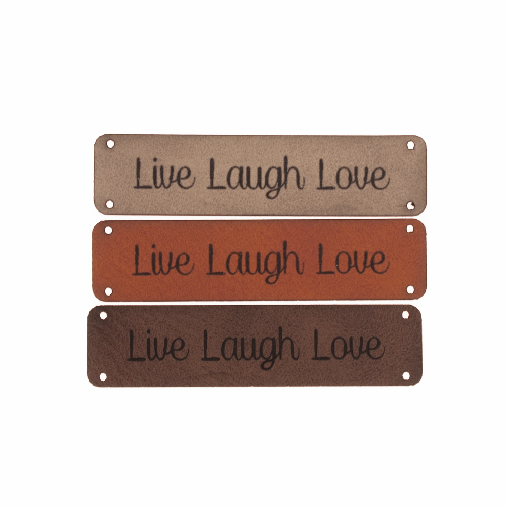 Het label is gemaakt van PU-kunstleer en is verkrijgbaar in verschillende kleuren en wasbaar tot 40c. Met deze unieke labels maak je altijd iets speciaals. Bevestig eenvoudig door de gaten in het label met naald en draad aan je werk te bevestigen. Alle leren labels zijn verkrijgbaar in verschillende kleuren. Bestel nu je eigen met de tekst ‘Live Laugh Love’