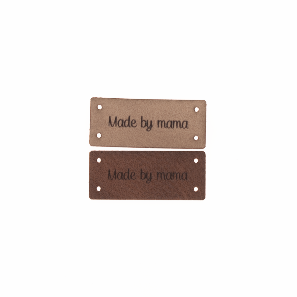 Leren label met de tekst 'Made by Mama' in de maat 20mm bij 50mm. Verkrijgbaar in verschillende kleuren. Eenvoudig te bevestigen aan je handwerk door de 4 gaten in het label.