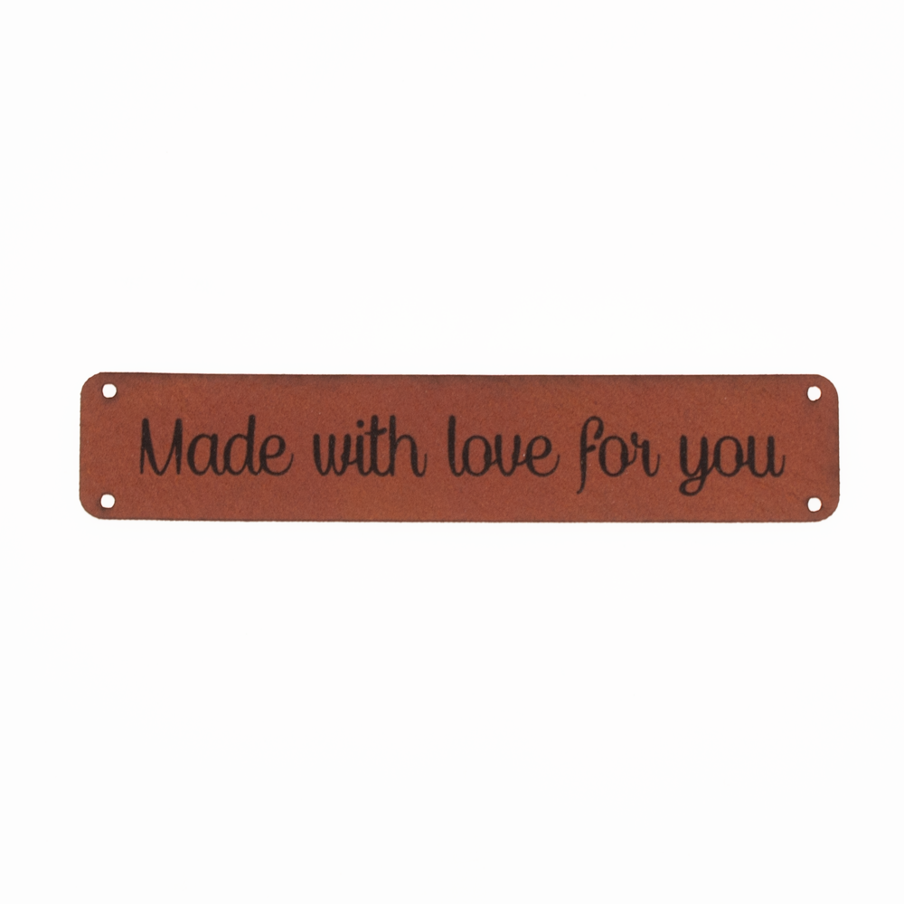 Leren label met de tekst 'Made with love for you' in de maat 15mm bij 75mm. Verkrijgbaar in verschillende kleuren. Eenvoudig te bevestigen aan je handwerk door de 4 gaten in het label.