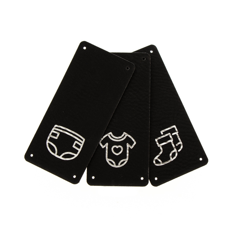 Leren vouwbaar label met iconen van Baby Kleding in de maat 30mm bij 65mm. Bevestig eenvoudig door het label vast te naaien. Verkrijgbaar in verschillende kleuren. Verpakt per set van 3 stuks