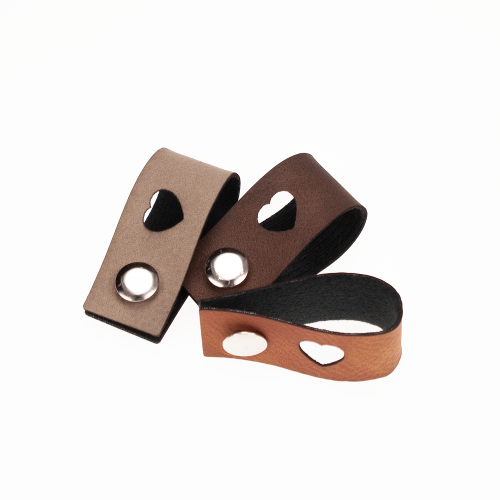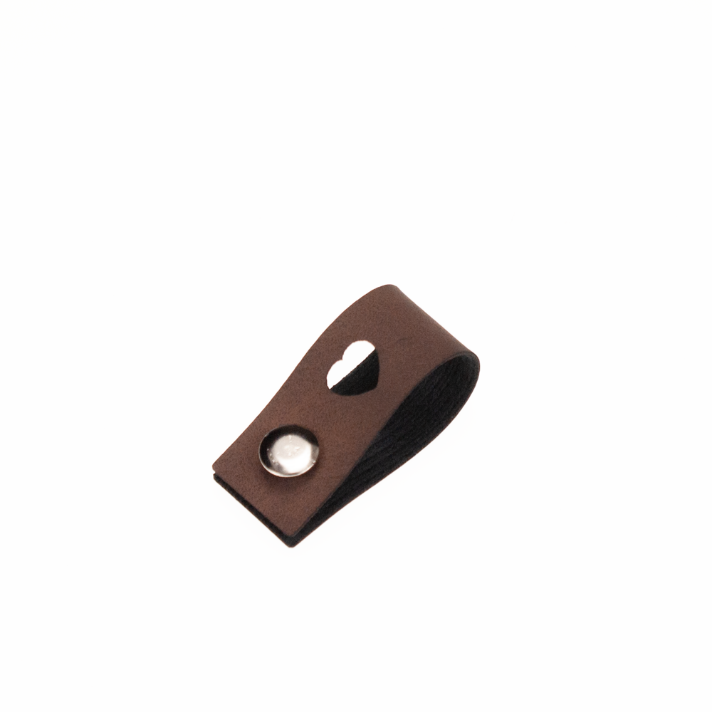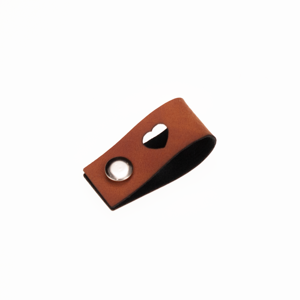 Leren vouwbaar label met uitgesneden hartje in de maat 20mm bij 100mm. Bevestig eenvoudig als een lus met het bijgeleverde schroefbare sluiting. Verkrijgbaar in verschillende kleuren.