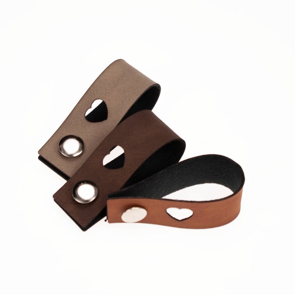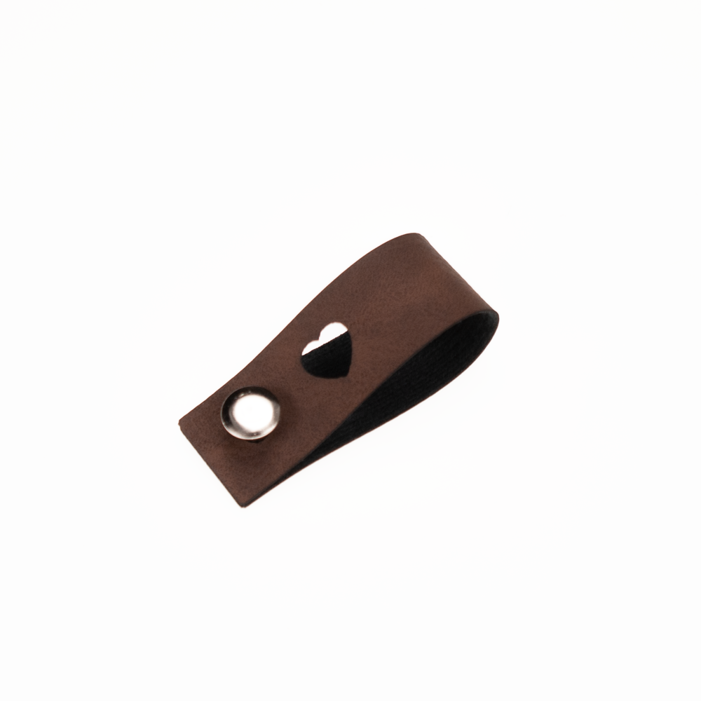 Leren vouwbaar label met uitgesneden hartje in de maat 20mm bij 120mm. Bevestig eenvoudig als een lus met het bijgeleverde schroefbare sluiting. Verkrijgbaar in verschillende kleuren.