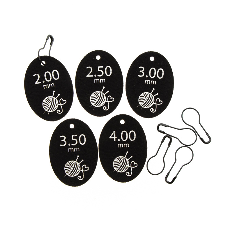 In deze set zitten de maten 2,00 - 2,50 - 3,00 - 3,50 - 4,00 speciaal voor je breiwerk met afbeelding van bol garen met breinaalden. Van iedere maat zitten er 2 stuks in. Compleet met metalen steekmarkeerders om de Needle tags te bevestigen. De Needle tag is gemaakt van zwart PU-kunstleer en wasbaar tot 40c.
