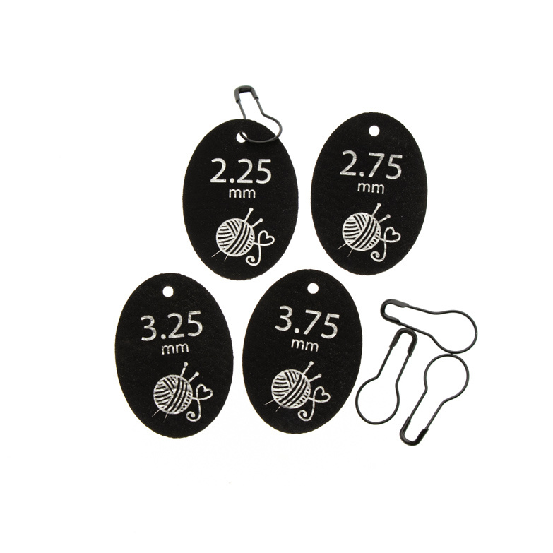 In deze set zitten de maten 2,25 - 2,75 - 3,25 - 3,75 speciaal voor je breiwerk met afbeelding van bol garen met breinaalden. Van iedere maat zitten er 2 stuks in. Compleet met metalen steekmarkeerders om de Needle tags te bevestigen. De Needle tag is gemaakt van zwart PU-kunstleer en wasbaar tot 40c.