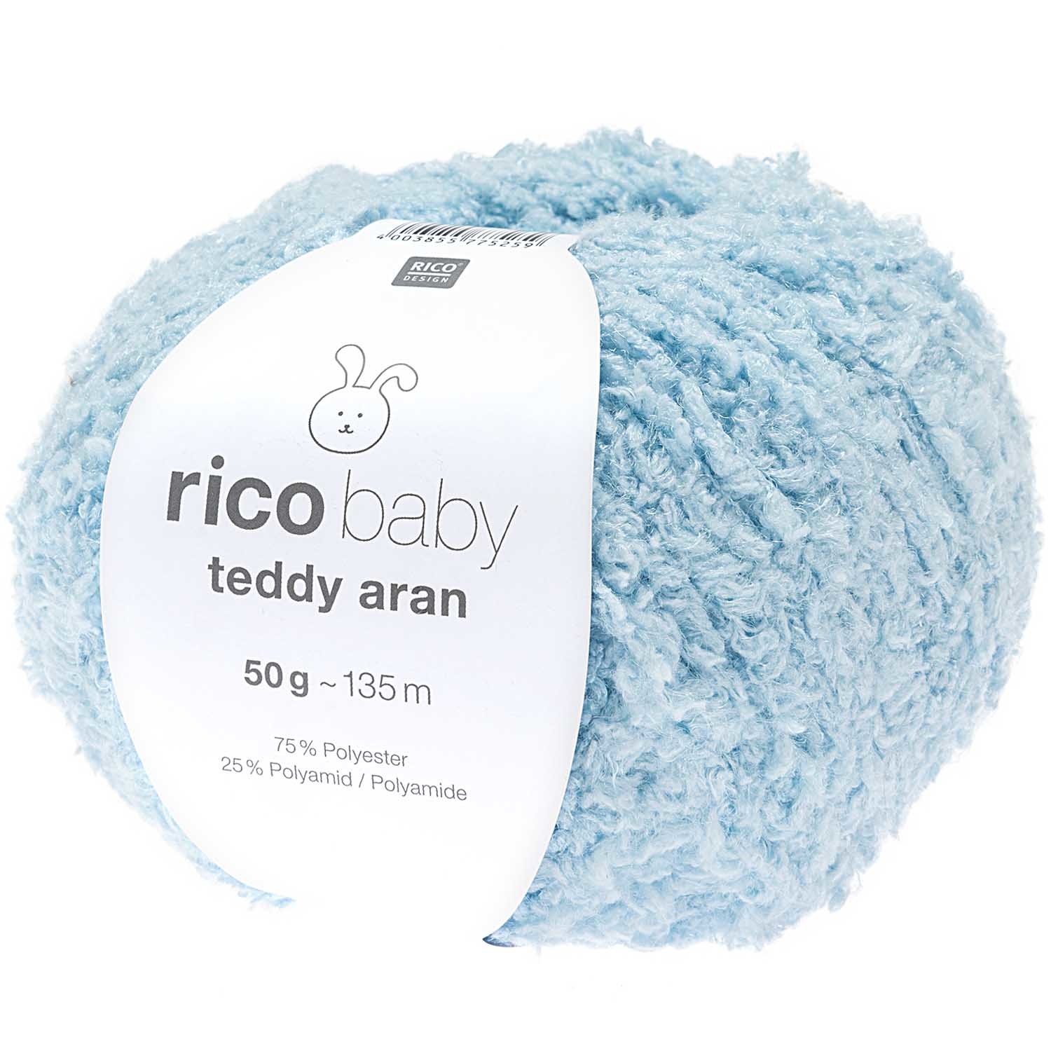 Rico Design Baby Teddy Aran is een zacht pluizig garen van een mengsel van polyester en polyamide en ideaal in gebreide babytruitjes en dekens of in knuffels.
