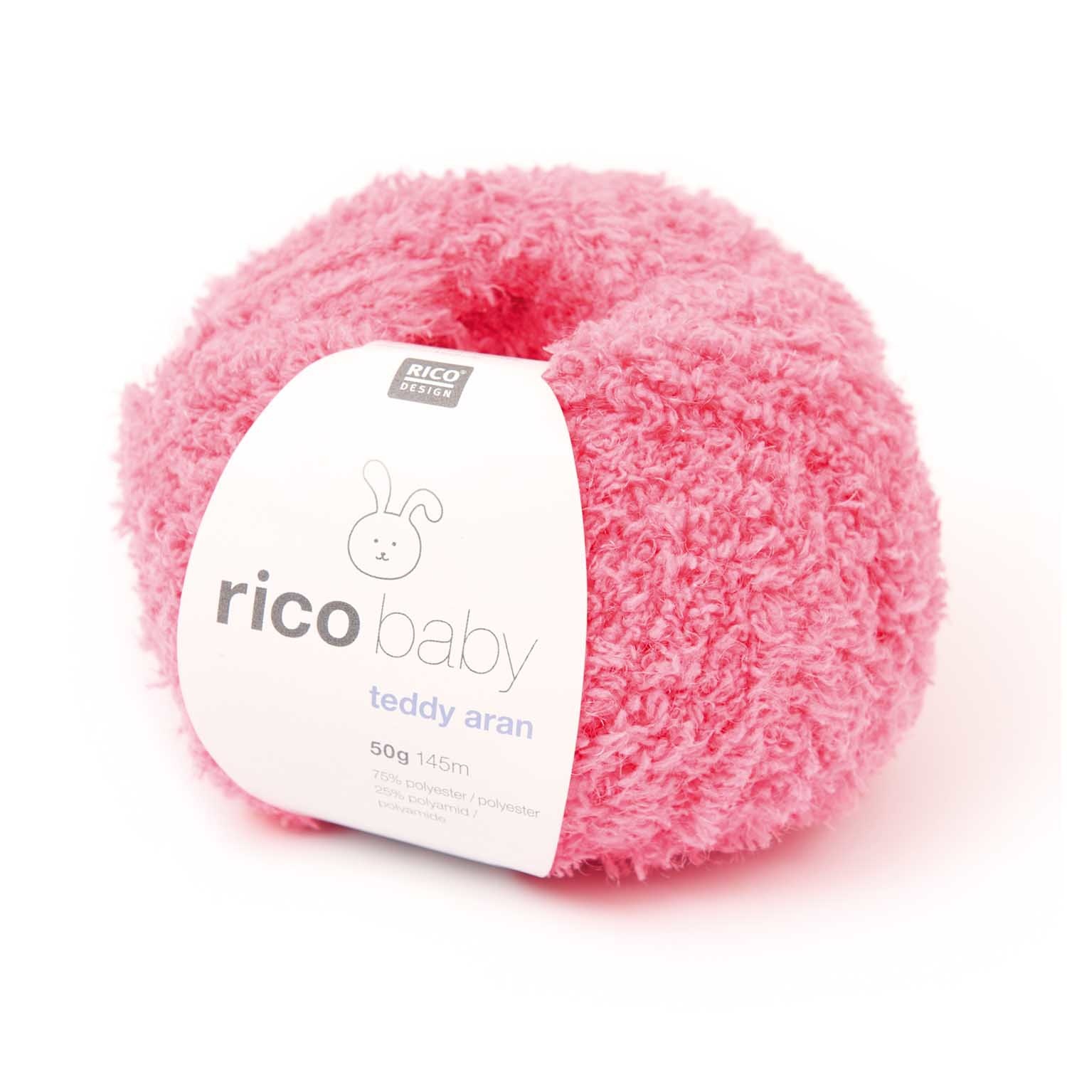 Rico Design Baby Teddy Aran is een zacht pluizig garen van een mengsel van polyester en polyamide en ideaal in gebreide babytruitjes en dekens of in knuffels.