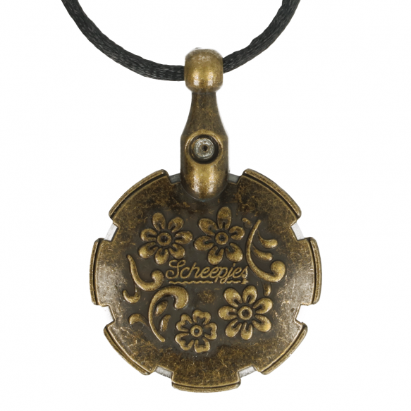 De versierde hanger heeft een geïntegreerd mes dat de opslag en de toepassing uiterst veilig maakt. Het garen of de draad kan in een van de inkepingen worden gesneden. De garensnijder is versierd als een sieraad met stenen en wordt geleverd met een koord om op te hangen. De garensnijder is verkrijgbaar in verschillende metaalkleuren.