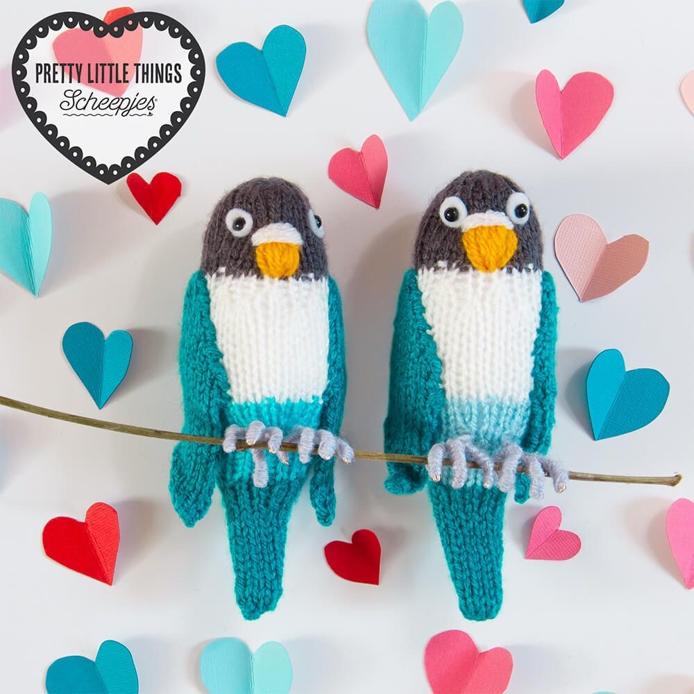 Het eerste patroon is de schattige gebreide Lovebirds, ontworpen door Cher Marcus en gemaakt met Scheepjes Colour Crafter.